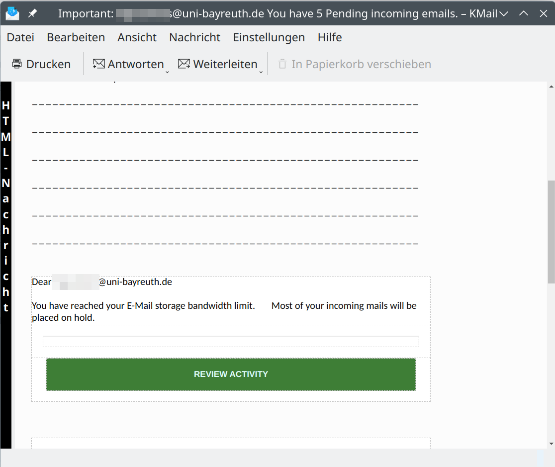 Die folgende Email ist leicht als Fälschung zu erkennen, da die Absenderadresse keine von der Uni Bayreuth ist, die angebliche Größe des Speichers nicht stimmt und bei vollem Speicher keine Validierung mit der Eingabe des Passworts erforderlich ist.