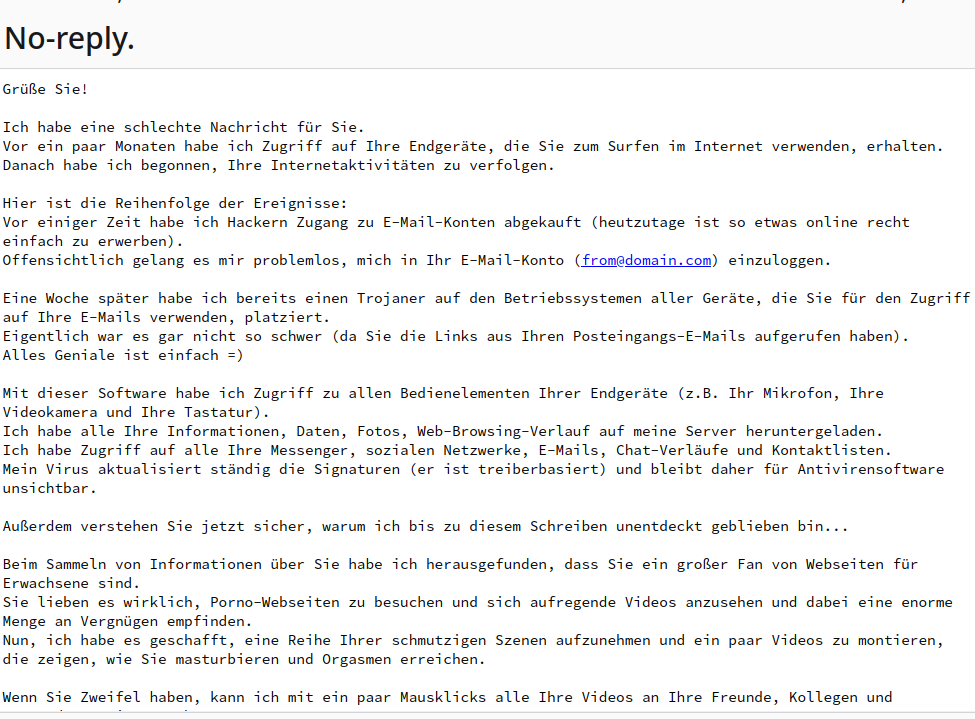 Diese frei erfundene Schad-E-Mail möchte von Ihnen durch Erpressung Geld ergaunern. Bitte tun Sie nichts, außer die Schad-E-Mail zu löschen.
